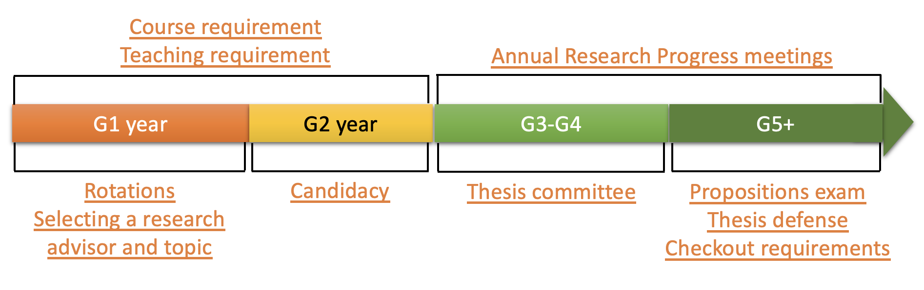In the G5 year, the student will be expected to demonstrate satisfactory progress in the course of thesis research. To this end, an appropriate timetable for completion of the degree requirements will be discussed and agreed upon at the annual research progress meeting in the G5 year.