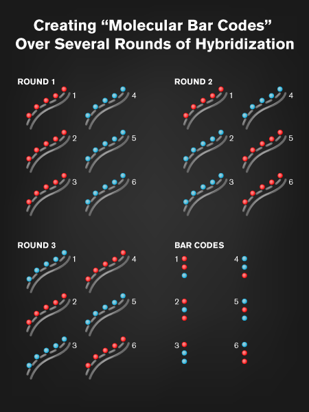 Cai's team realized that the same handful of fluorophores could be used in sequential rounds of hybridization to create thousands of unique fluorescent bar codes that could clearly identify many types of molecules (see graphic at right).