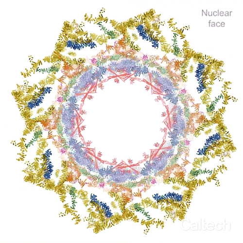 Among those pieces of machinery, and one of the most complex, is something known as the nuclear pore complex (NPC). The NPC, which is made of more than 1,000 individual proteins, is an incredibly discriminating gatekeeper for the cell's nucleus, the membrane-bound region inside a cell that holds that cell's genetic material. Anything going in or out of the nucleus has to pass through the NPC on its way.