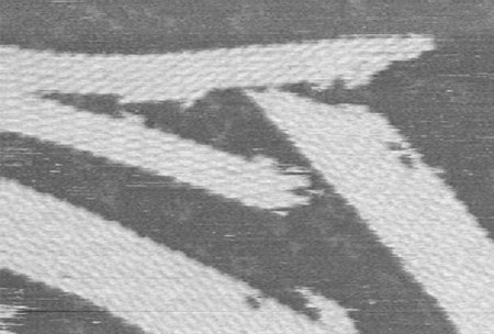 DNA tile ribbons (shown here in an atomic force microscopy image) can store information in their arrangement of tilesâ€"12.5nm x 4nm x 2nm self-assembled DNA structures. This information can be propagated during ribbon growth, and replicated in a cycle of ribbon growth and breakage, or scission.